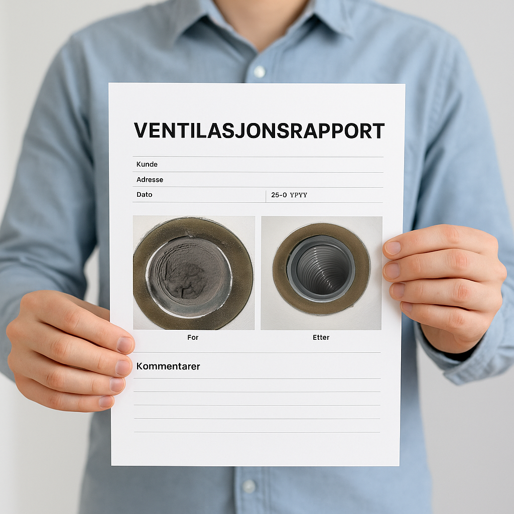 Til slutt tester vi luftstrømmen og sjekker at ventilasjonen fungerer optimalt. Du får en rapport med bilder før og etter rens, samt eventuelle anbefalinger for videre vedlikehold.